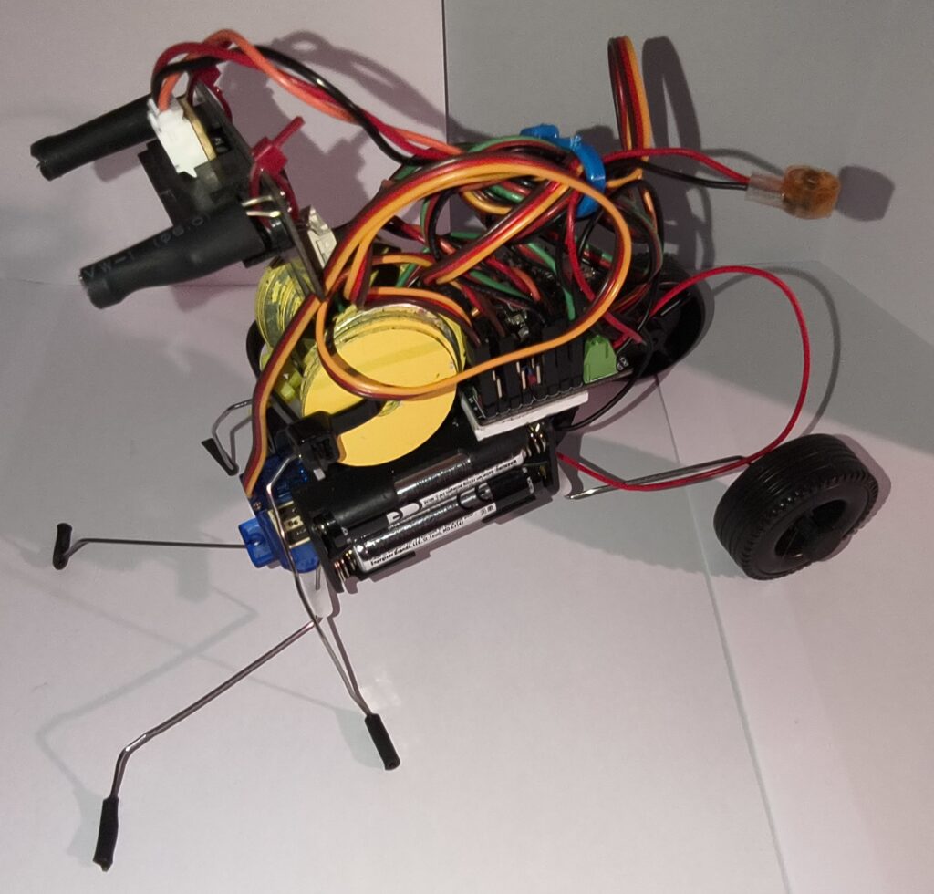 This device crawls at the moment. The rear wheels are, for now, freewheeling so they’re dragged. Imagining the front ‘whiskas’ additionally detecting something or other as they sweep from side to side.